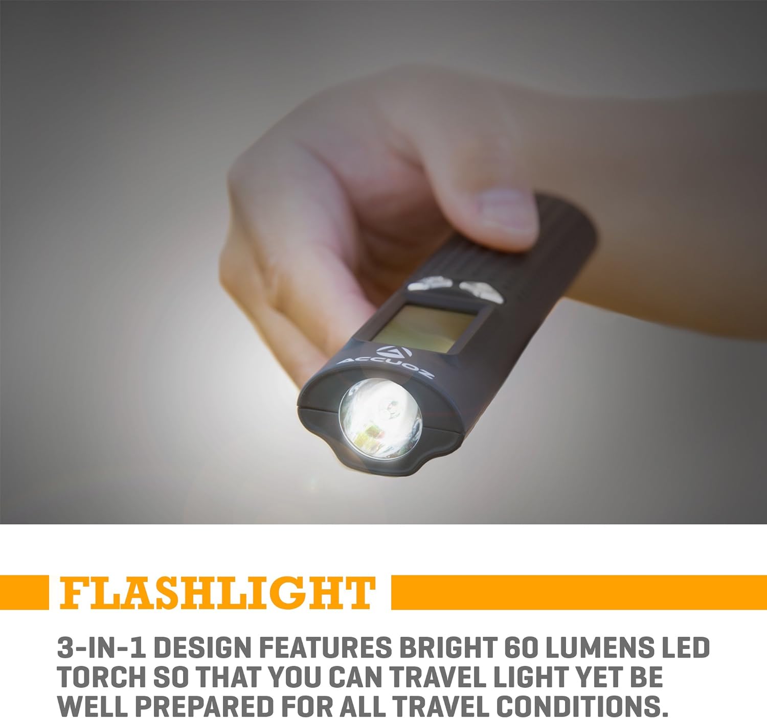 Product Description: Introducing the Accuoz Rechargeable Digital Luggage Scale that serves as your ultimate travel companion. This multifunctional device is not just a luggage scale but a 2600mAh portable charger and LED flashlight as well. With its high-precision sensor, the Accuoz luggage scale can precisely measure up to 110lbs of weight, making it easy for you to keep track of your luggage’s weight and avoid any extra baggage charges at the airport. The measurement results are quickly displayed on a clear and easy-to-read LCD digital display panel. It also incorporates a tare function for precision accuracy. The 2600mAh powerful portable charger helps you keep your devices powered up during your journeys. It is compatible with most smartphones, tablets, and other USB-powered devices. In addition to that, it features a bright LED flashlight to help you find your way in the dark. This all-in-one device is compact and lightweight, making it easy to carry around. The Accuoz Luggage Scale has been designed with an easy grip handle to comfortably measure the weight of your luggage. The reliable stainless steel hanging hook can accommodate any handle size. With a sleek design and high-quality materials, the Accuoz Rechargeable Digital Luggage Scale is durable and resistant to wear and tear. You may charge this unit using the USB cable that comes with the package. The charge level is indicated by four blue LED lights. Bring convenience to your travel life with this 3-in-1 Accuoz Rechargeable Digital Luggage Scale. An essential gadget for every traveler, this easy-to-use travel accessory helps you save time, money, and stress. Product Dimensions: 5.1 x 1.6 x 0.9 inches Package Includes: 1 x Digital Luggage Scale, 1 x USB Charging Cable, 1 x User Manual. Warranty: We also provide a one-year warranty for quality-related issues and 24/7 customer service for maximum purchaser satisfaction. If you have any questions about the product, feel free to contact us. Order your Accuoz Rechargeable Digital Luggage Scale – 2600mAh Portable Charger & LED Flashlight today and travel smartly.