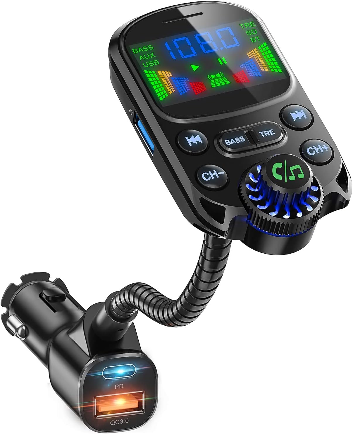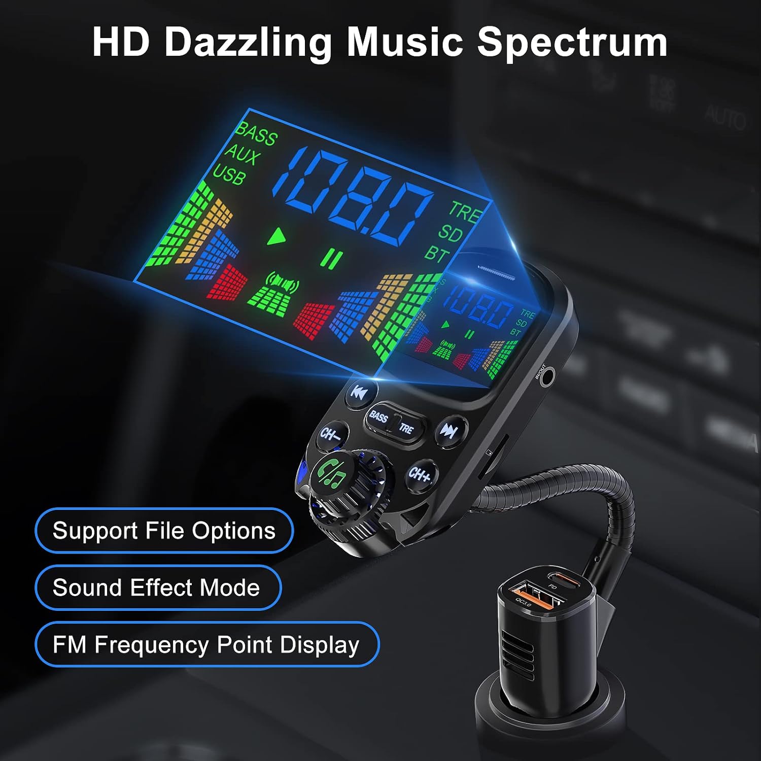 Product Description: The SOARUN Bluetooth 5.3 FM Transmitter for Car is a top-of-the-line device that combines high-tech features and unmatched performance to give you the best in-car audio experience. This versatile Car Adapter is equipped with the latest Bluetooth 5.3 technology for seamless and stable connectivity, allowing you to stream music, podcasts, or audiobooks from your Bluetooth-enabled devices without any interruptions. It offers a Power Delivery of 30W and a USB port for fast charging, ensuring your devices are always ready for use. One of the standout features of the SOARUN Bluetooth Car Adapter is its extraordinary HiFi Treble and Bass Player. It enhances the audio performance offering crystal clear sound quality that immerses you in a live-concert-like music atmosphere right in your car. The adapter features a large 1.6″ Display for easy accessibility, helping you to manage your calls and music with just a glance. Also has hands-free calling feature so you can take calls without holding your phone, providing a safer driving experience. This device also includes a car radio with AUX input/output, meaning you can connect your non-Bluetooth devices with ease. The added TF card slot allows you to play your favorite tunes even without a connected device. The SOARUN Bluetooth 5.3 FM Transmitter for Car is not just a Bluetooth car adapter, but a companion that catifies your journey. So why wait? Give your car audio a major upgrade with the SOARUN Bluetooth FM Transmitter.