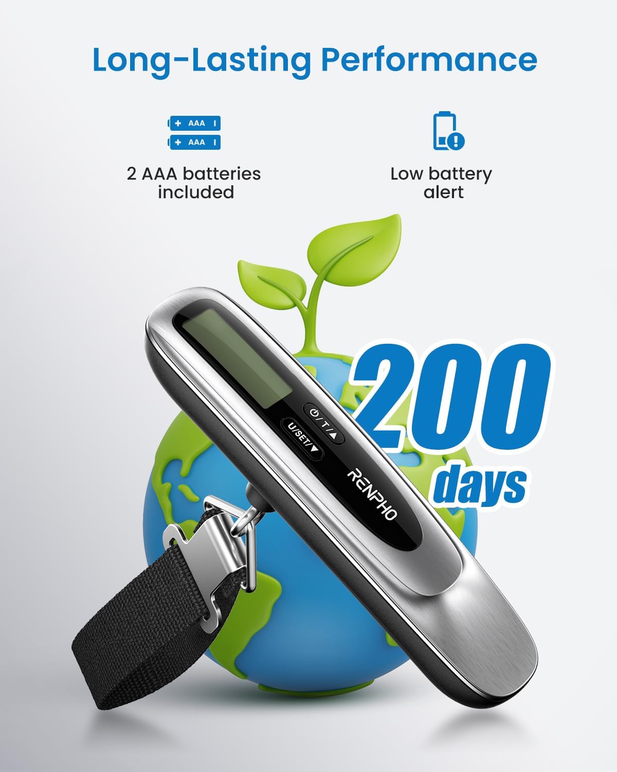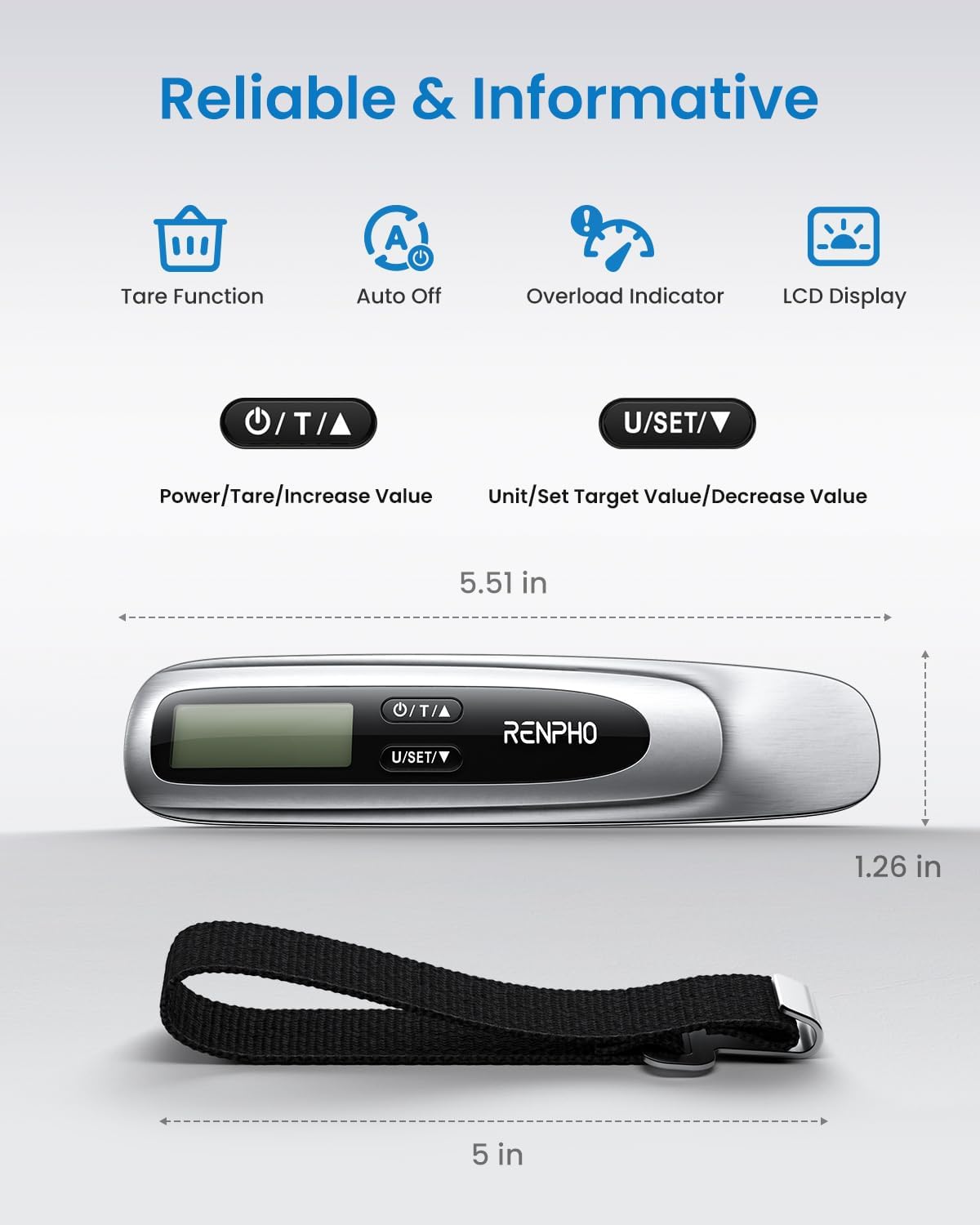 Product Description: Get a simple solution to all your overweight baggage troubles with the RENPHO Luggage Scale! This sleek-scale, perfect for travelers and designed to alleviate the issues of stress and excess baggage charges at the airport. With a maximum weight limit of 110lbs/50kg, this scale is perfect for any travel adventure and adheres to major airlines’ weight restrictions. Featuring an easy-to-read backlit LCD, the toolkit ensures you can read measurements clearly, even in dim light. The RENPHO Luggage Scale comes with a convenient Tare Function allowing you to subtract the weight of the container or the bag to get the net weight of the items inside. This feature is handy when you need to measure multiple items together. Another marquee feature is the Overweight Reminder, which alerts you when your luggage exceeds the preset weight limit, steering clear of extra charges at the airport check-in. The scale is encased in durable rubber paint, ensuring a comfortable and secured grip while scaling your luggage. Unlike other standard scales, this luggage scale is light, compact, and easy to carry. The RENPHO Luggage Scale is powered by a long-lasting battery, which is included in the package, and instantly powers up with a simple button operation, saving you precious time when you’re on the move. This user-friendly suitcase scale is your perfect travel companion ensuring smooth and hassle-free air travel. Take the stress out of travel and keep your baggage in check with the RENPHO Luggage Scale. Indeed, a must-have for all travel enthusiasts! Happy traveling!